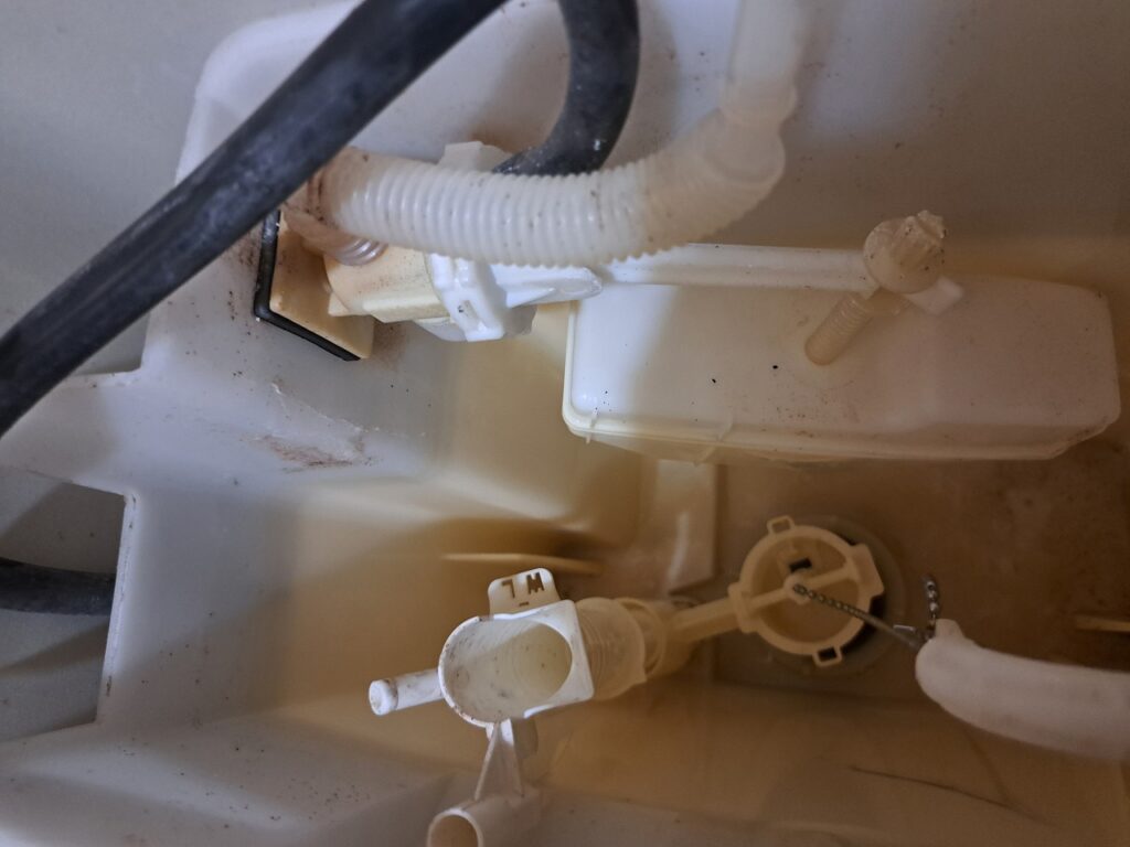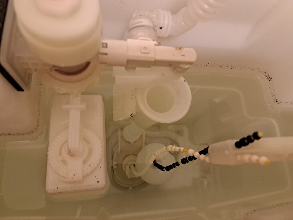 外部には漏れないので、気が付きにくいのですが、便座の蓋を開けると、溜り水が波打っていることが有ります。ロータンク内で貯まった水を止め、レバーを引くと止水している弁が上がり、水が流れて、弁が落ちると水を貯めます。ゴム製品なので、経年劣化して隙間から水が漏れるのです。