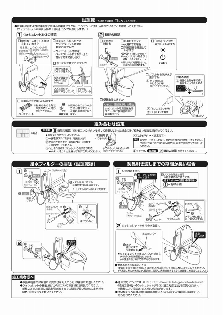 試運転は、便器と便座の間にビニールを敷いて、水を被らないように注意します。配管のなかの空気が抜けるまで水はでません。暫くおまちください。