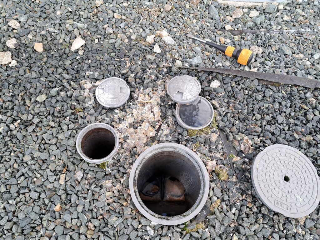 屋外の排水桝に油が詰まって排水桝の蓋を押し上げて溢れた状態です。