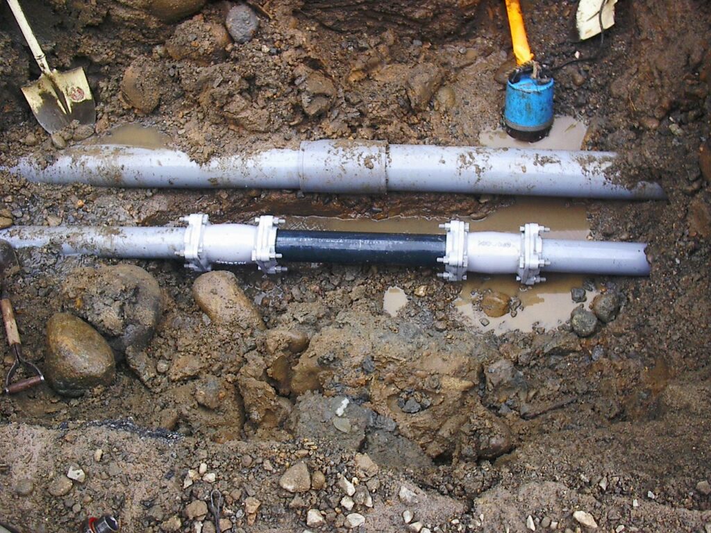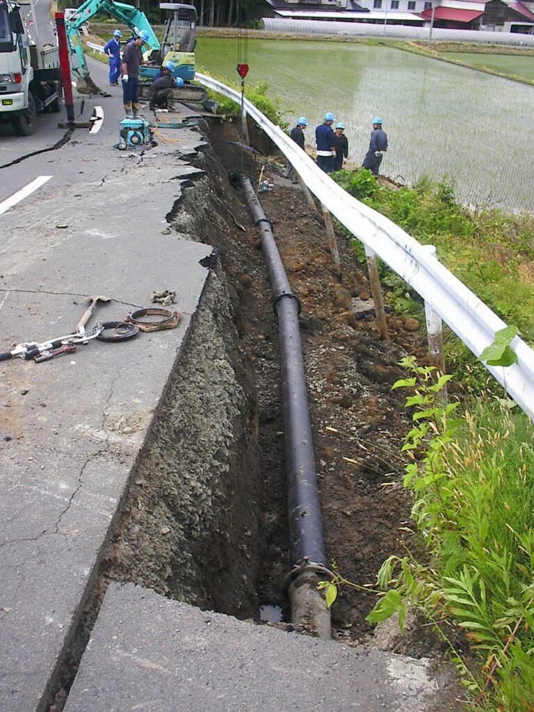岩手宮城内陸地震の時は、震源が近かったので特に奥州市若柳地区は、送水管・配水管の損傷で漏水修繕に走り回った記憶に新しいです。施工当時、平成6年頃の配管は、ダクタイル鋳鉄管A型の継手で、屈曲部前後には離脱防止金具(抜け防止)が使われていますが、直管部分は普通継手と言って、抜け防止機能の無い継手が使われています。坂の法面が崩れ、配管もそのまま押し出されて配管が抜けてしまい漏水が発生しました。坂の上に配水施設があり、浄水施設から配水施設まで送水する主要な配管でした。当時近くの配水施設から、この配水施設まで仮設配管で、この配水施設まで水を送っていました。地元業者総出の復旧作業で乗り切ることが出来ました。