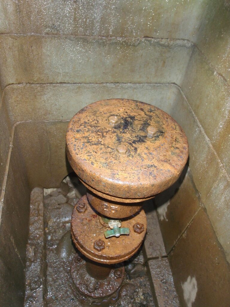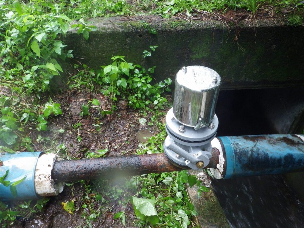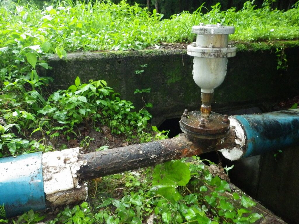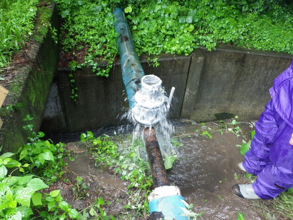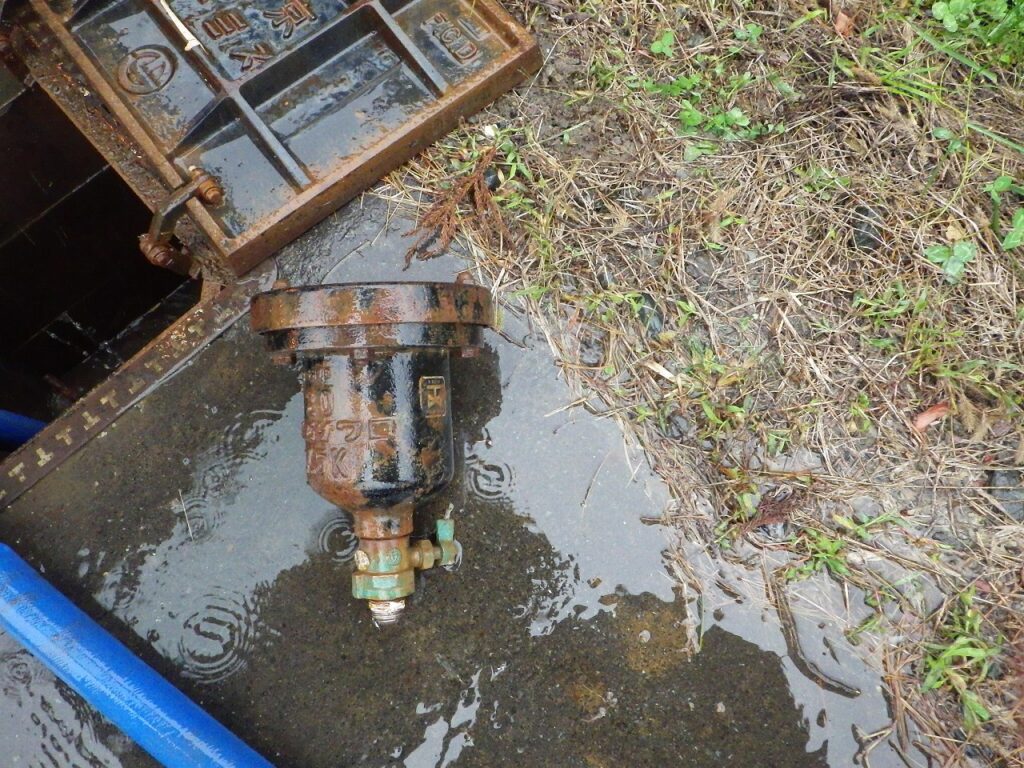 上の写真は、補修弁が無く断水して劣化した空気弁を交換。メンテナンス用に補修弁を設置。水が出ているのは、排泥作業中です。